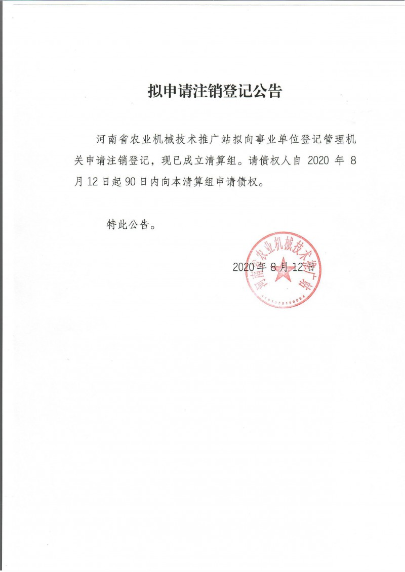 河南省農業機械技術推廣站擬申請注銷登記公告