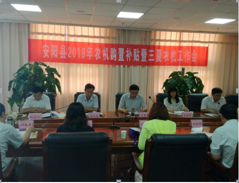5月30日上午,安陽縣(示范區)2018年農機購置補貼暨“三夏”農機工作會議在縣政府十樓會議室召開,縣政府副縣長何國峰、縣農機購置補貼領導小組成員單位、各鄉鎮主管農業副鄉鎮長和具體負責農機購置補貼工作人員參加了會議。