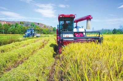 信陽市光山縣南向店鄉(xiāng)何畈村鑫磊合作社社員在搶收水稻。金秋十月,稻谷成熟,瓜果飄香,神州大地一片喜慶的豐收?qǐng)D景。 謝萬柏?cái)z