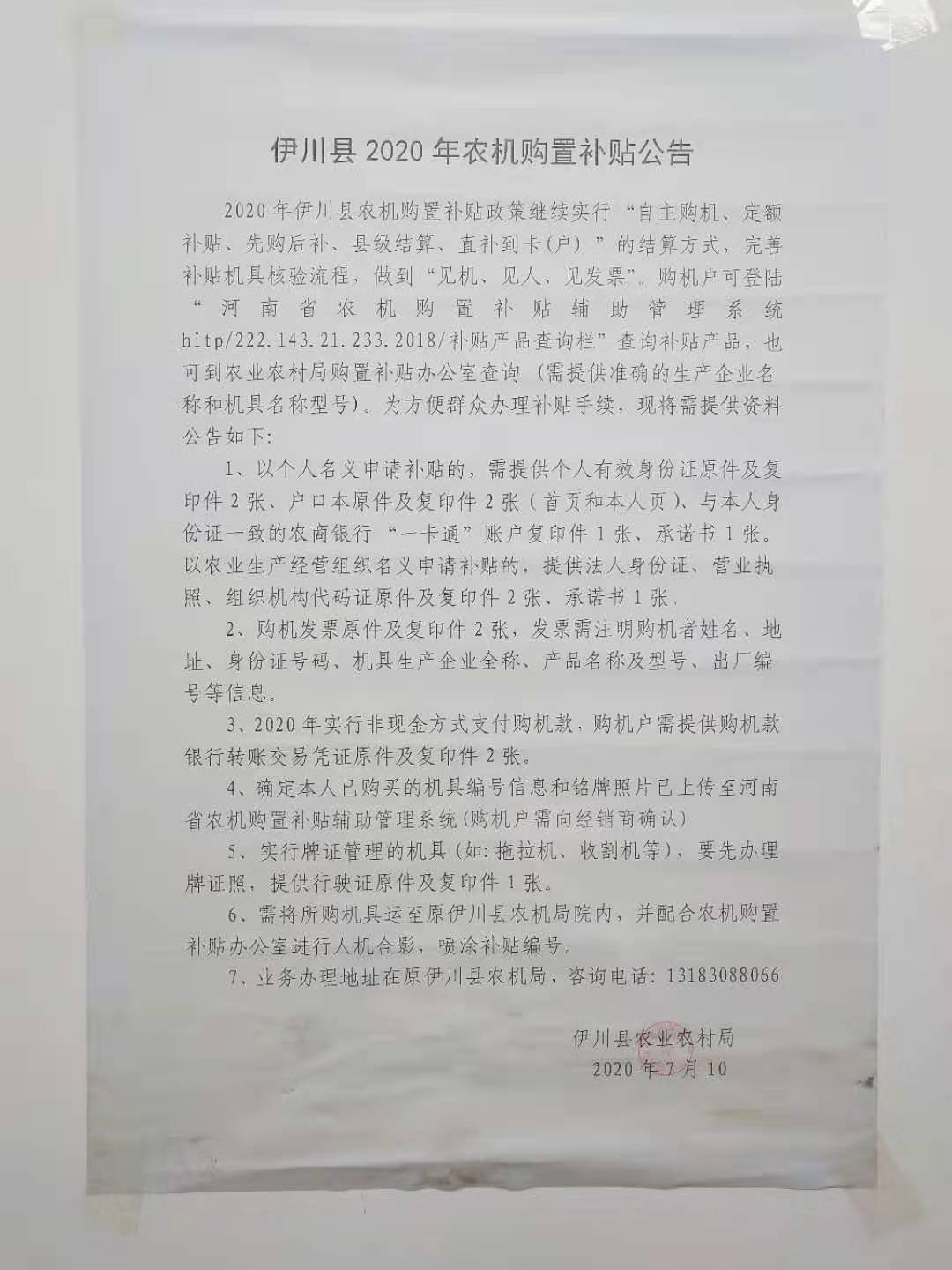 當(dāng)前位置:河南省農(nóng)機(jī)農(nóng)墾發(fā)展中心 專題 河南省農(nóng)機(jī)購(gòu)置與應(yīng)用補(bǔ)貼信息公開(kāi)專欄 信息公開(kāi) 洛陽(yáng)市 伊川縣